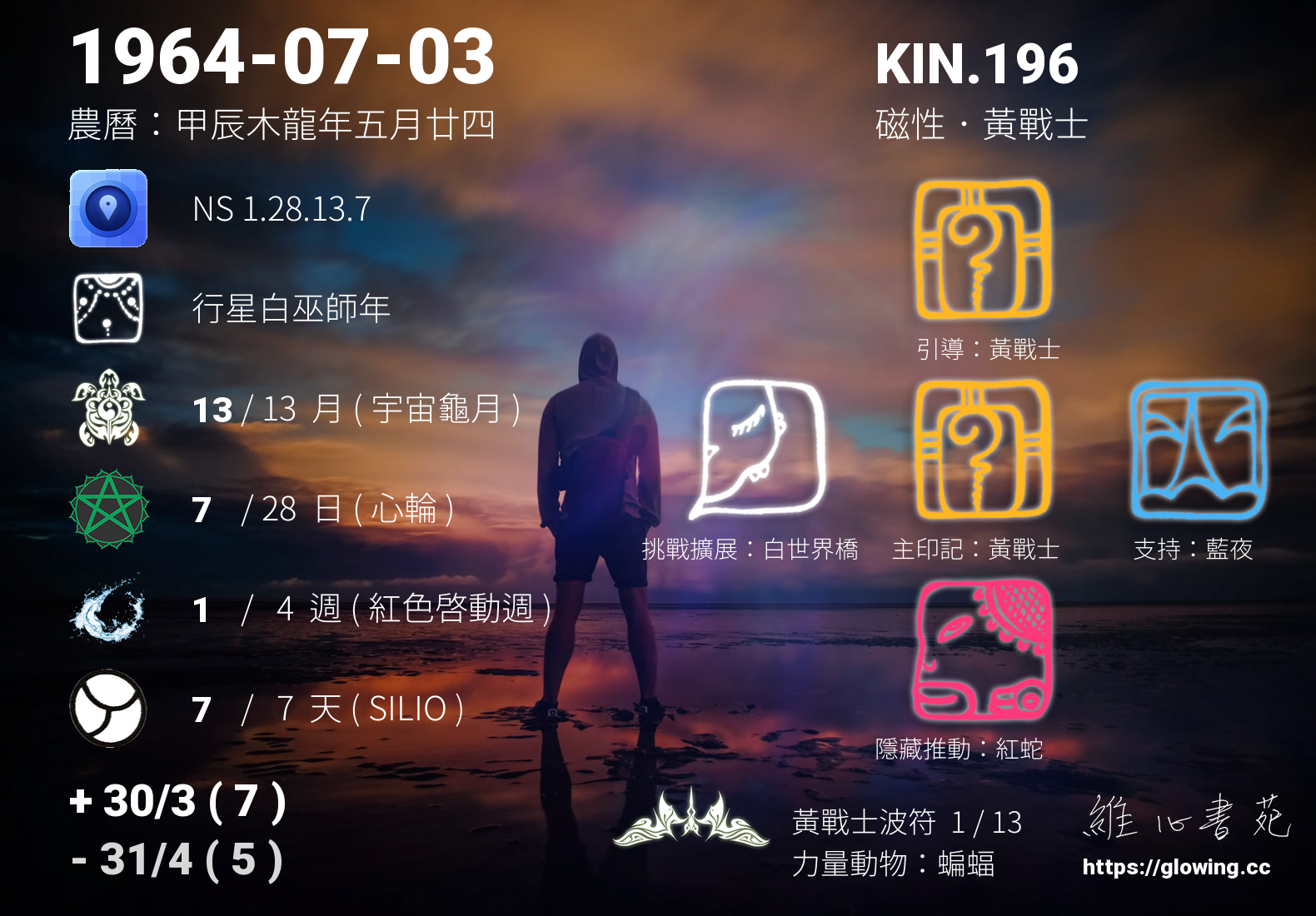 黃戰士的引導依據KIN的調性不同會有五種可能性,KIN.196的引導圖騰是黃戰士 , 黃戰士引導著我們勇敢無懼地去實現夢想,所有的夢想都需要時間去成就,在一步步的突破中我們需要無比的勇氣,黃戰士的無畏提供我們滋糧,讓我們堅實挺立不畏風霜,終將取得豐碩的成果。