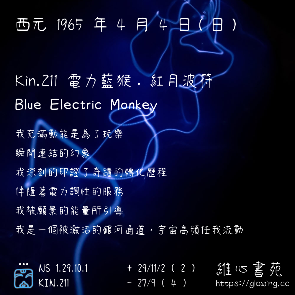 我們可以稱 KIN 211 為 【電力藍猴】 、 【電力的藍猴】 、 【紅月波符 之 電力藍猴】 也可以是 【電力藍猴.紅月波符】 ,你比較喜歡哪一個稱號呢?