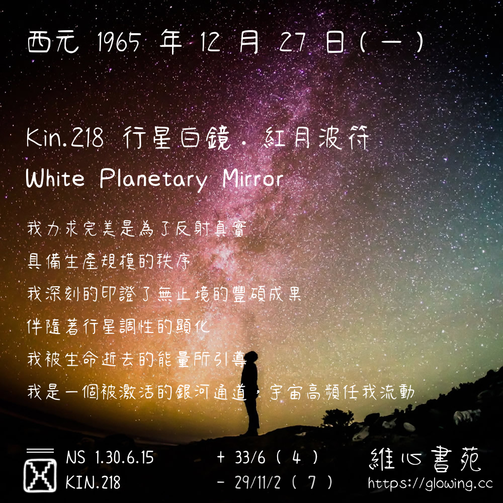 我們可以稱 KIN 218 為 【行星白鏡】 、 【行星的白鏡】 、 【紅月波符 之 行星白鏡】 也可以是 【行星白鏡.紅月波符】 ,你比較喜歡哪一個稱號呢?