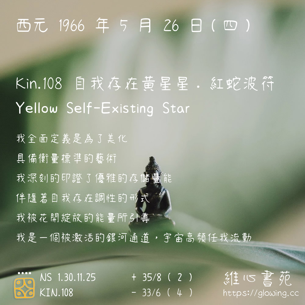 我們可以稱 KIN 108 為 【自我存在黃星星】 、 【自我存在的黃星星】 、 【紅蛇波符 之 自我存在黃星星】 也可以是 【自我存在黃星星.紅蛇波符】 ,你比較喜歡哪一個稱號呢?