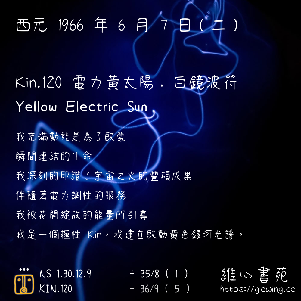 我們可以稱 KIN 120 為 【電力黃太陽】 、 【電力的黃太陽】 、 【白鏡波符 之 電力黃太陽】 也可以是 【電力黃太陽.白鏡波符】 ,你比較喜歡哪一個稱號呢?