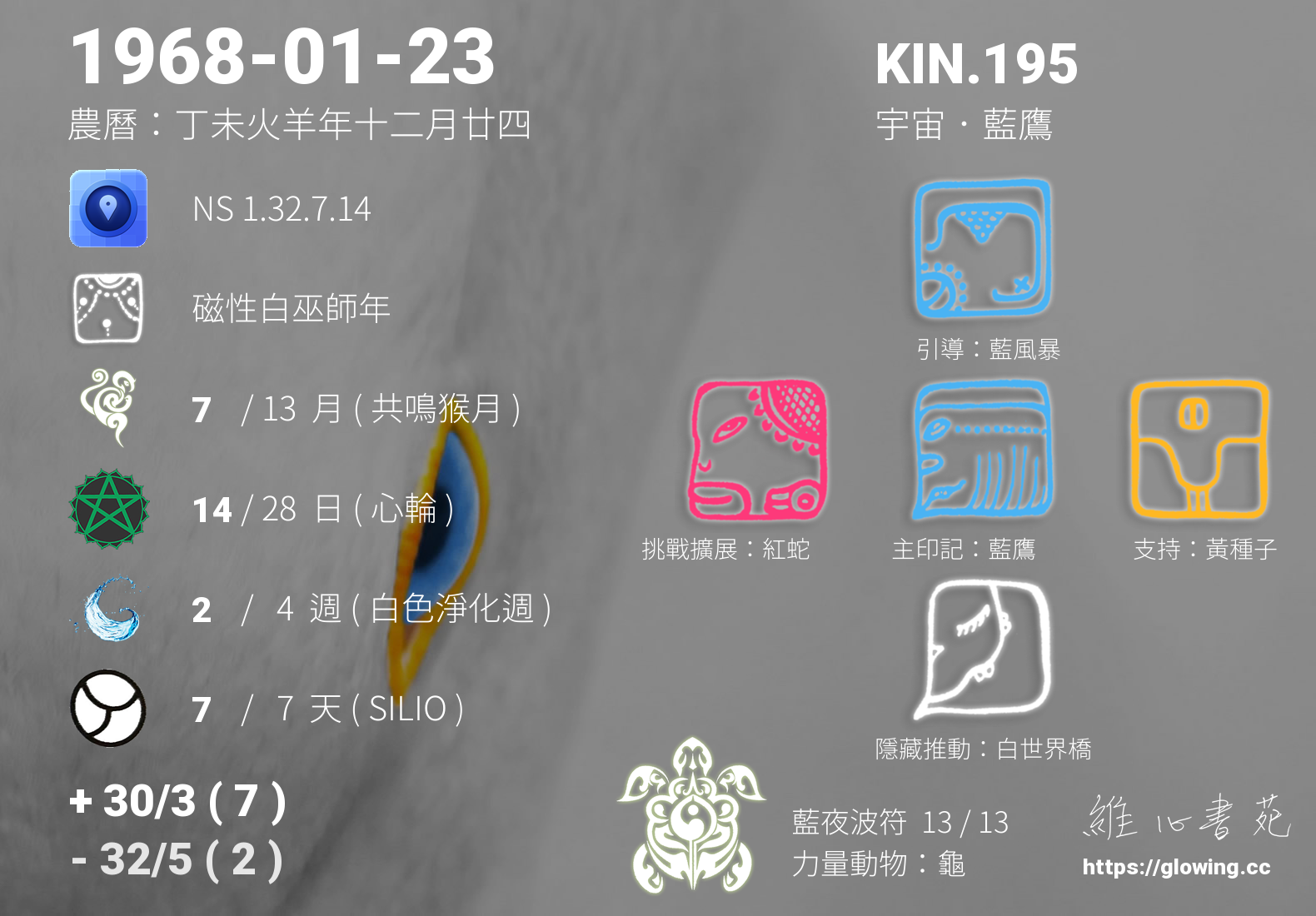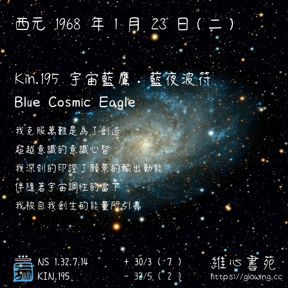 我們可以稱 KIN 195 為 【宇宙藍鷹】 、 【宇宙的藍鷹】 、 【藍夜波符 之 宇宙藍鷹】 也可以是 【宇宙藍鷹.藍夜波符】 ,你比較喜歡哪一個稱號呢?