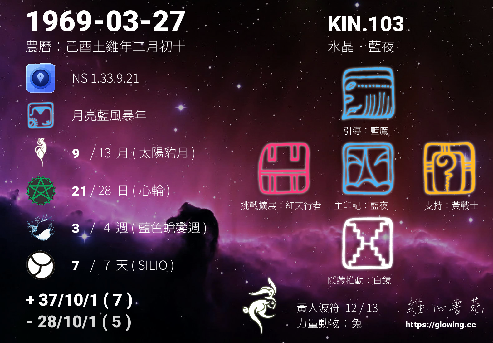 我們可以稱 KIN 103 為 【水晶藍夜】 、 【水晶的藍夜】 、 【黃人波符 之 水晶藍夜】 也可以是 【水晶藍夜.黃人波符】 ,你比較喜歡哪一個稱號呢?