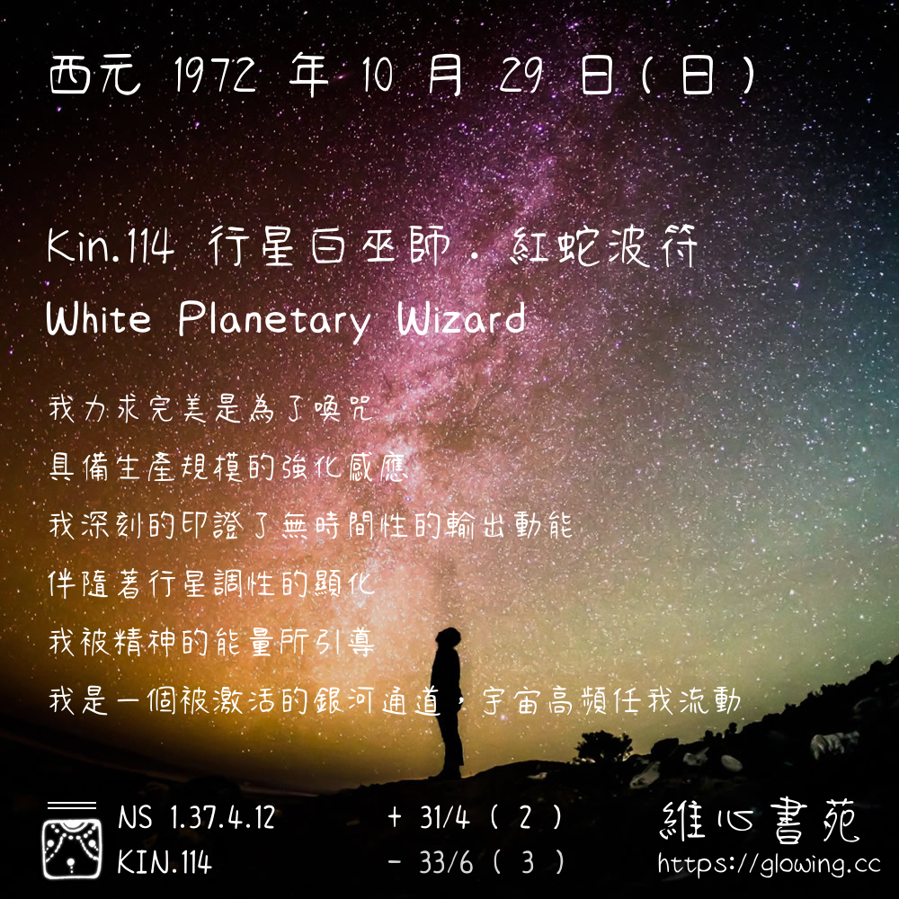 我們可以稱 KIN 114 為 【行星白巫師】 、 【行星的白巫師】 、 【紅蛇波符 之 行星白巫師】 也可以是 【行星白巫師.紅蛇波符】 ,你比較喜歡哪一個稱號呢?