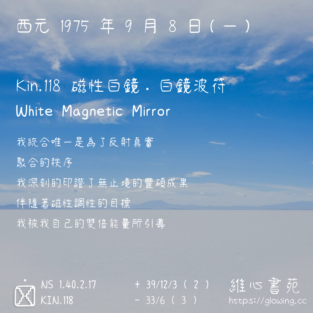 我們可以稱 KIN 118 為 【磁性白鏡】 、 【磁性的白鏡】 、 【白鏡波符 之 磁性白鏡】 也可以是 【磁性白鏡.白鏡波符】 ,你比較喜歡哪一個稱號呢?