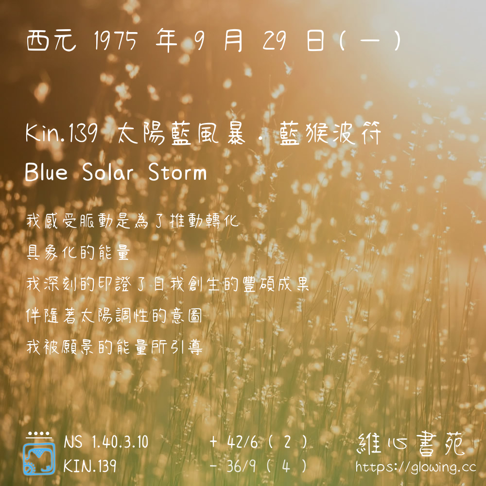 我們可以稱 KIN 139 為 【太陽藍風暴】 、 【太陽的藍風暴】 、 【藍猴波符 之 太陽藍風暴】 也可以是 【太陽藍風暴.藍猴波符】 ,你比較喜歡哪一個稱號呢?