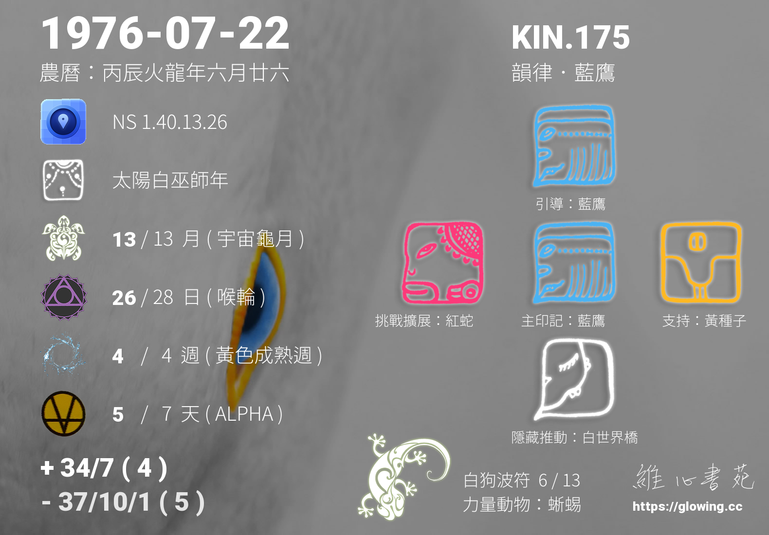 我們可以稱 KIN 175 為 【韻律藍鷹】 、 【韻律的藍鷹】 、 【白狗波符 之 韻律藍鷹】 也可以是 【韻律藍鷹.白狗波符】 ,你比較喜歡哪一個稱號呢?