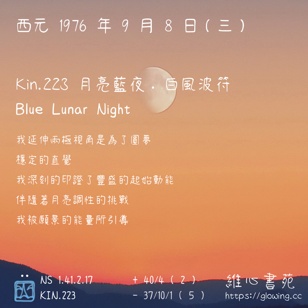 我們可以稱 KIN 223 為 【月亮藍夜】 、 【月亮的藍夜】 、 【白風波符 之 月亮藍夜】 也可以是 【月亮藍夜.白風波符】 ,你比較喜歡哪一個稱號呢?
