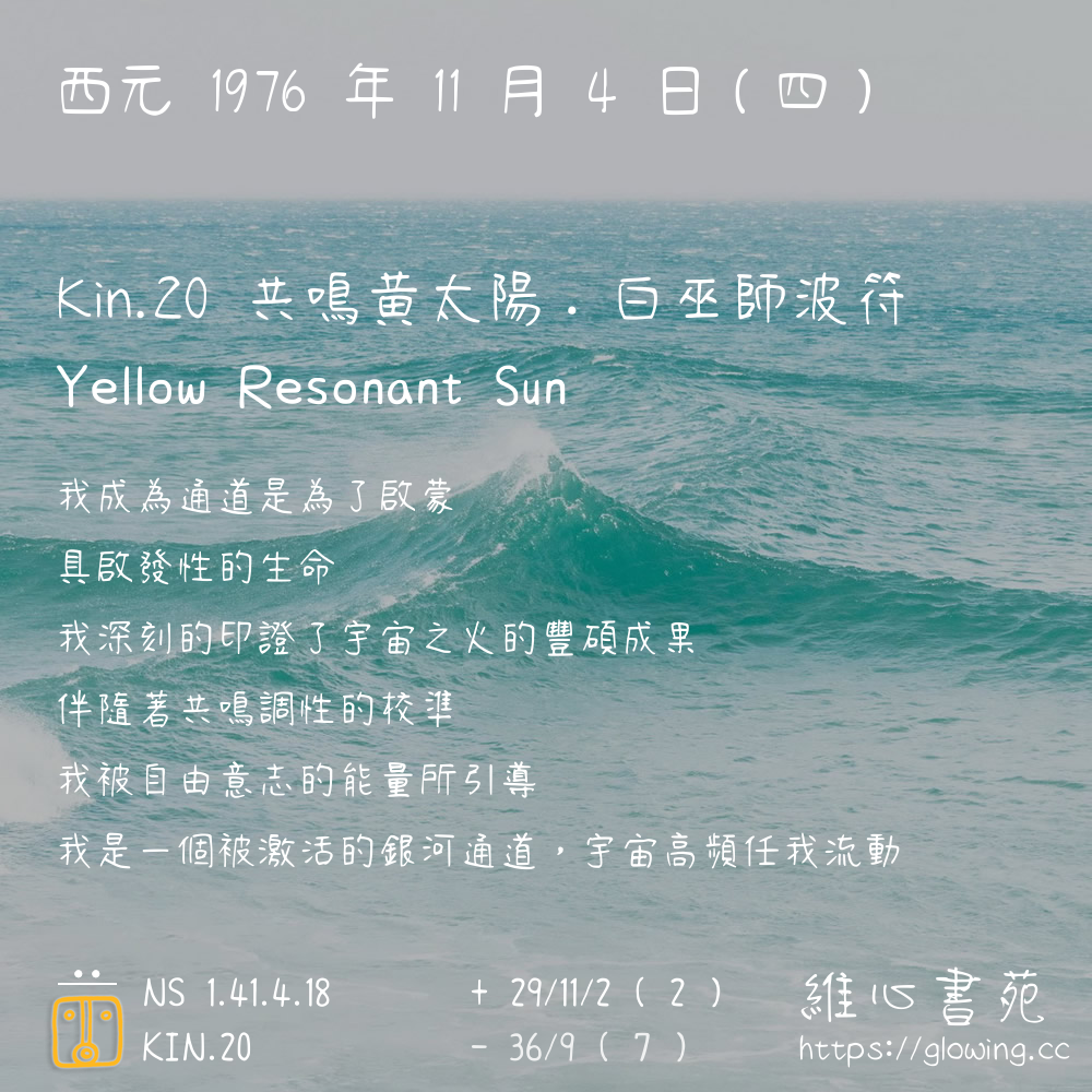 我們可以稱 KIN 20 為 【共鳴黃太陽】 、 【共鳴的黃太陽】 、 【白巫師波符 之 共鳴黃太陽】 也可以是 【共鳴黃太陽.白巫師波符】 ,你比較喜歡哪一個稱號呢?