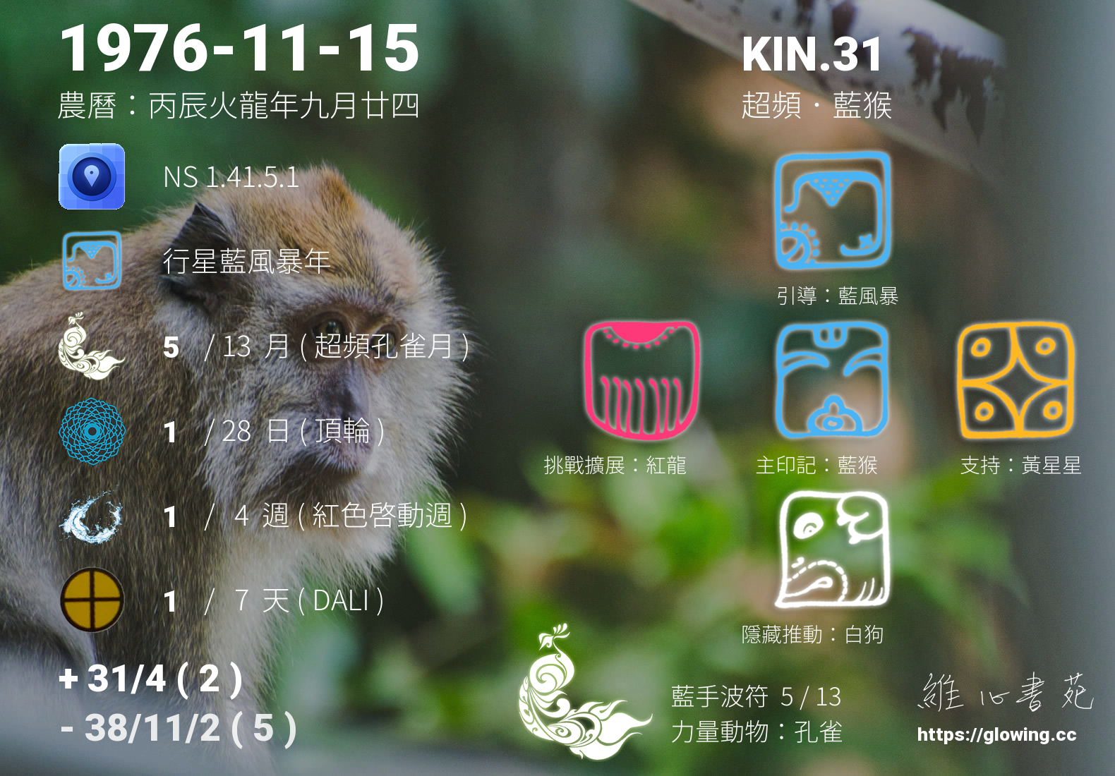 我們可以稱 KIN 31 為 【超頻藍猴】 、 【超頻的藍猴】 、 【藍手波符 之 超頻藍猴】 也可以是 【超頻藍猴.藍手波符】 ,你比較喜歡哪一個稱號呢?