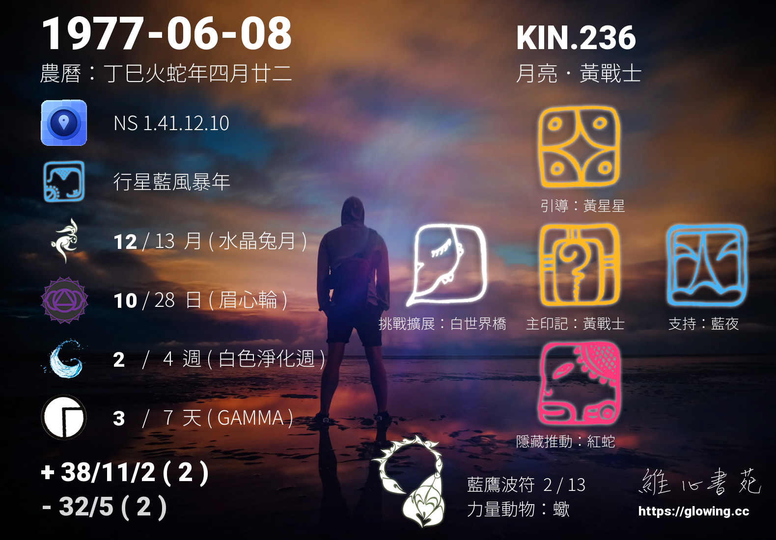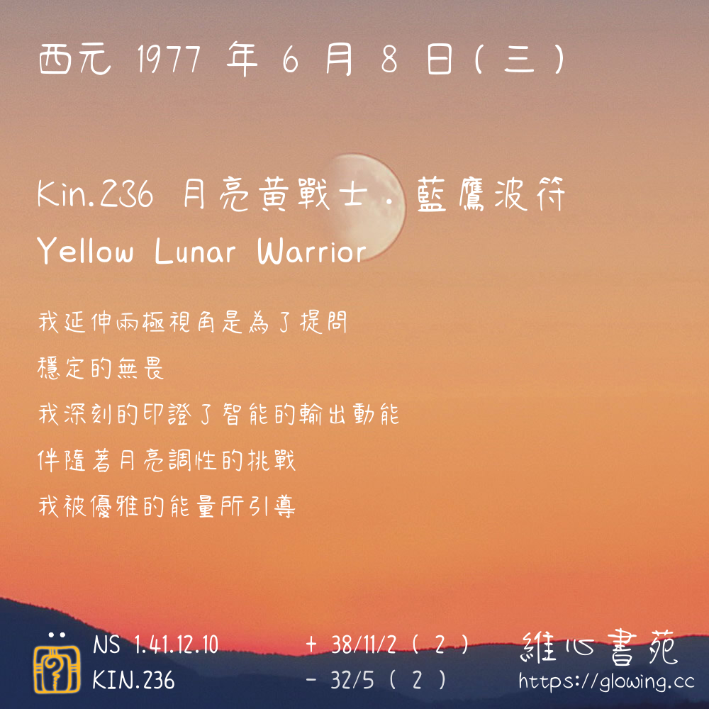 我們可以稱 KIN 236 為 【月亮黃戰士】 、 【月亮的黃戰士】 、 【藍鷹波符 之 月亮黃戰士】 也可以是 【月亮黃戰士.藍鷹波符】 ,你比較喜歡哪一個稱號呢?