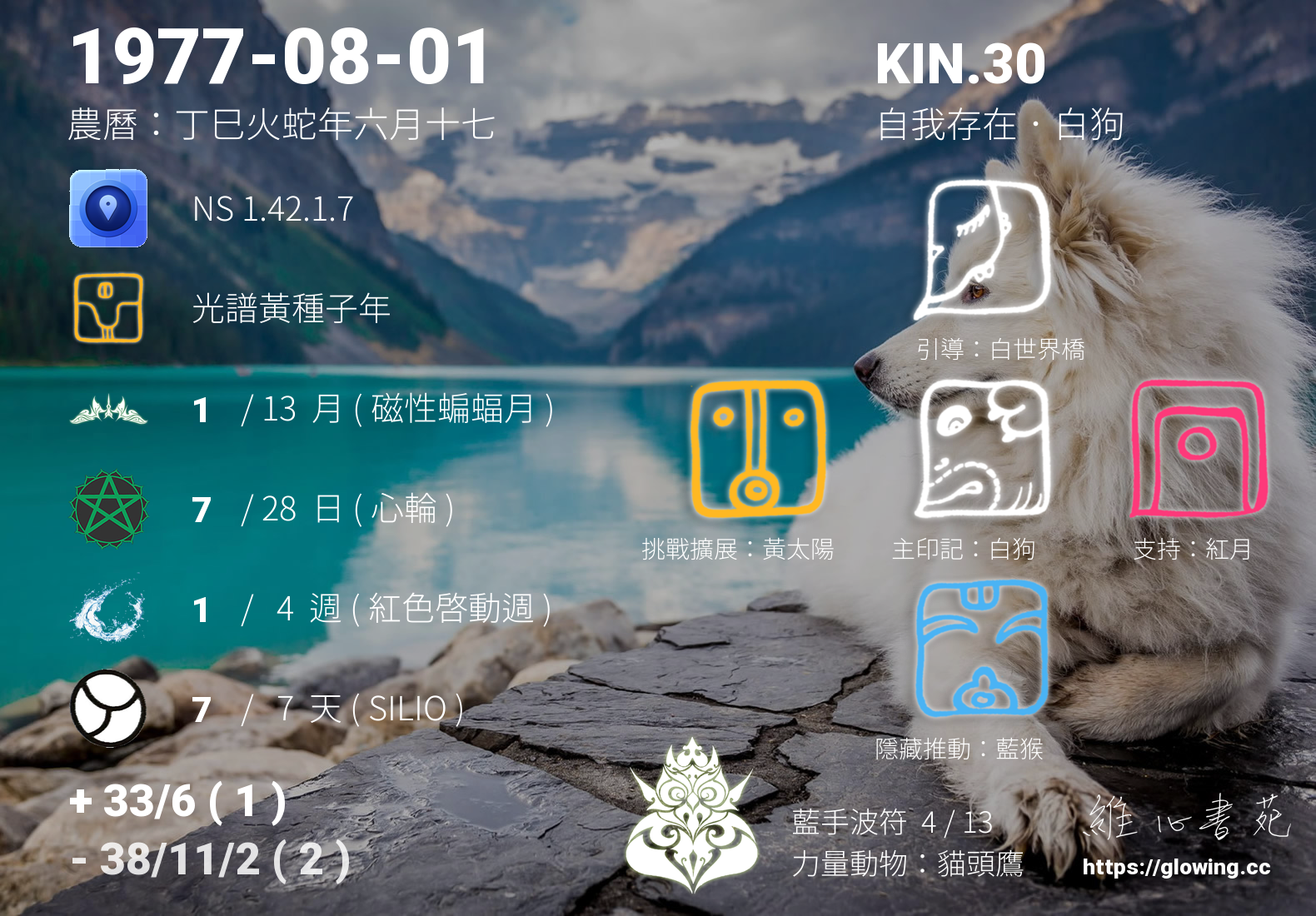 今天的星際原型圖騰為白狗,我們稱之為主印記, 白狗的主題是愛與忠誠,總是給人一種全然付出不求回報的感受,然而請千萬記得唯有先愛自己才能給予他人全然的愛是永恆的真理。