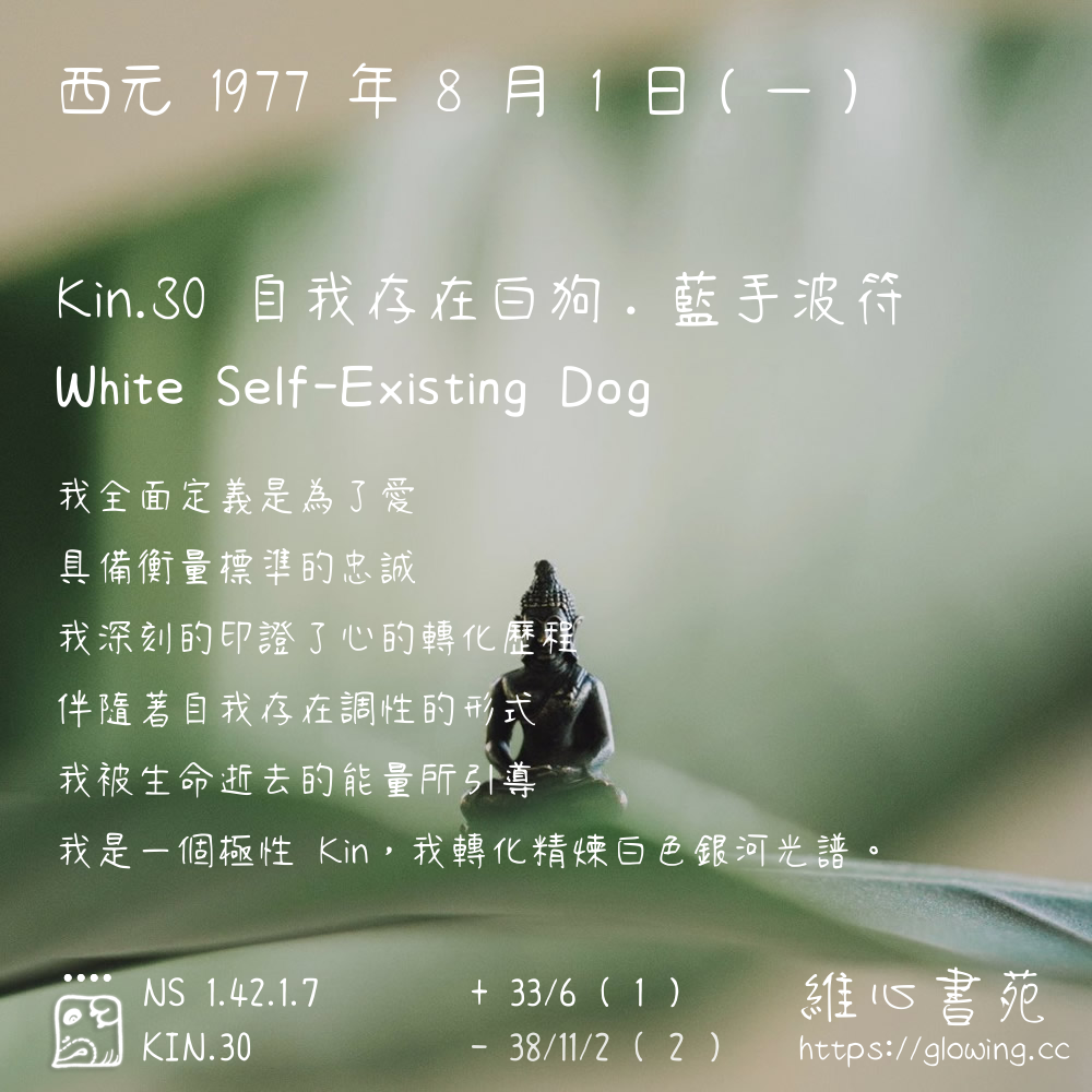 我們可以稱 KIN 30 為 【自我存在白狗】 、 【自我存在的白狗】 、 【藍手波符 之 自我存在白狗】 也可以是 【自我存在白狗.藍手波符】 ,你比較喜歡哪一個稱號呢?
