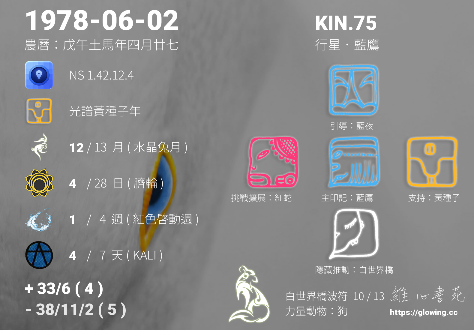 我們可以稱 KIN 75 為 【行星藍鷹】 、 【行星的藍鷹】 、 【白世界橋波符 之 行星藍鷹】 也可以是 【行星藍鷹.白世界橋波符】 ,你比較喜歡哪一個稱號呢?