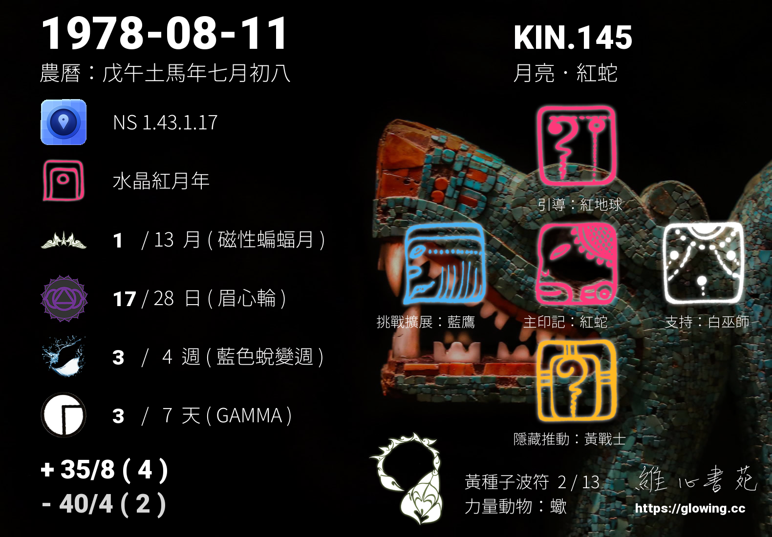我們可以稱 KIN 145 為 【月亮紅蛇】 、 【月亮的紅蛇】 、 【黃種子波符 之 月亮紅蛇】 也可以是 【月亮紅蛇.黃種子波符】 ,你比較喜歡哪一個稱號呢?