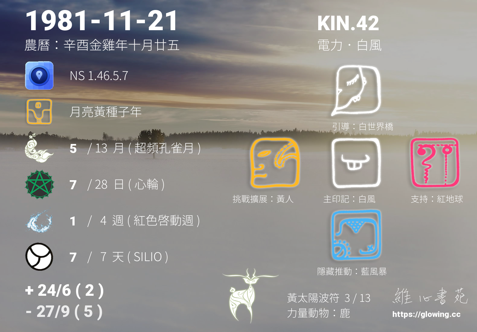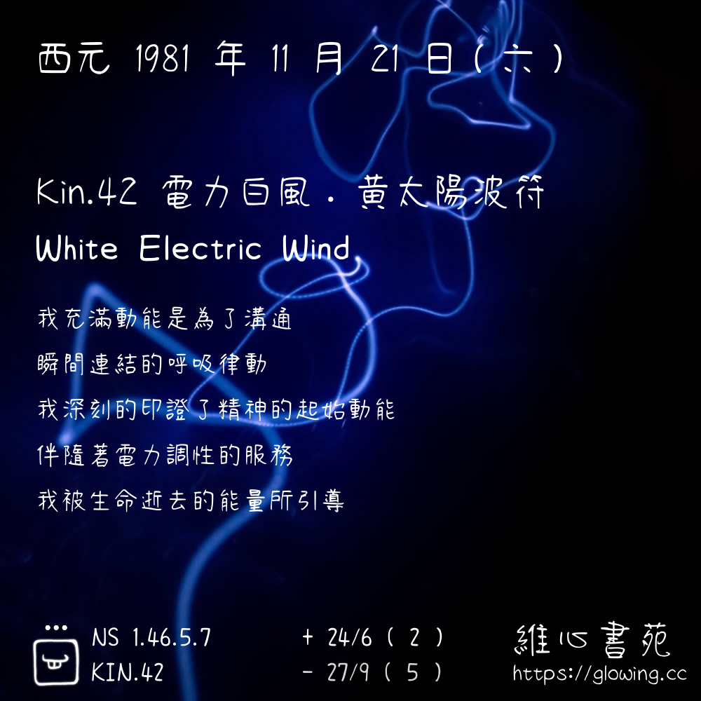 我們可以稱 KIN 42 為 【電力白風】 、 【電力的白風】 、 【黃太陽波符 之 電力白風】 也可以是 【電力白風.黃太陽波符】 ,你比較喜歡哪一個稱號呢?