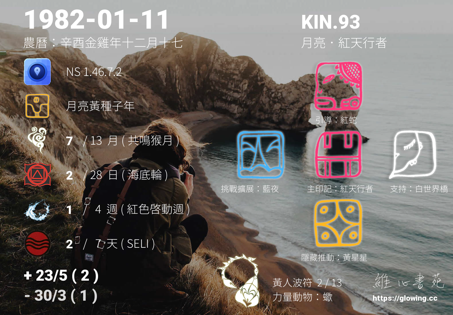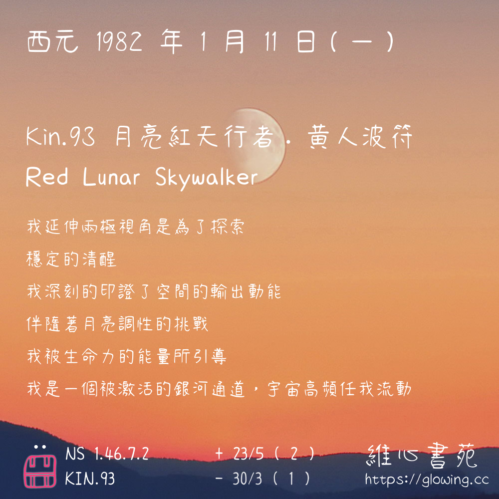 我們可以稱 KIN 93 為 【月亮紅天行者】 、 【月亮的紅天行者】 、 【黃人波符 之 月亮紅天行者】 也可以是 【月亮紅天行者.黃人波符】 ,你比較喜歡哪一個稱號呢?