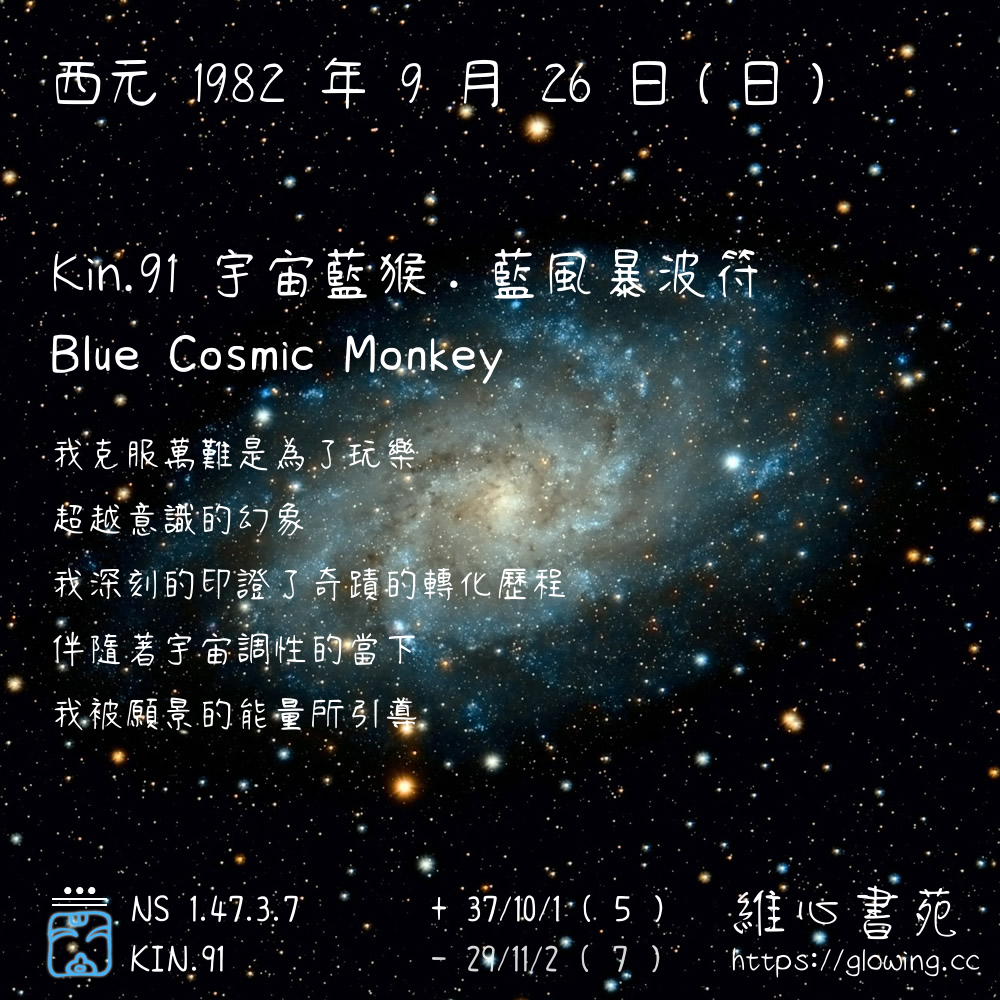 我們可以稱 KIN 91 為 【宇宙藍猴】 、 【宇宙的藍猴】 、 【藍風暴波符 之 宇宙藍猴】 也可以是 【宇宙藍猴.藍風暴波符】 ,你比較喜歡哪一個稱號呢?