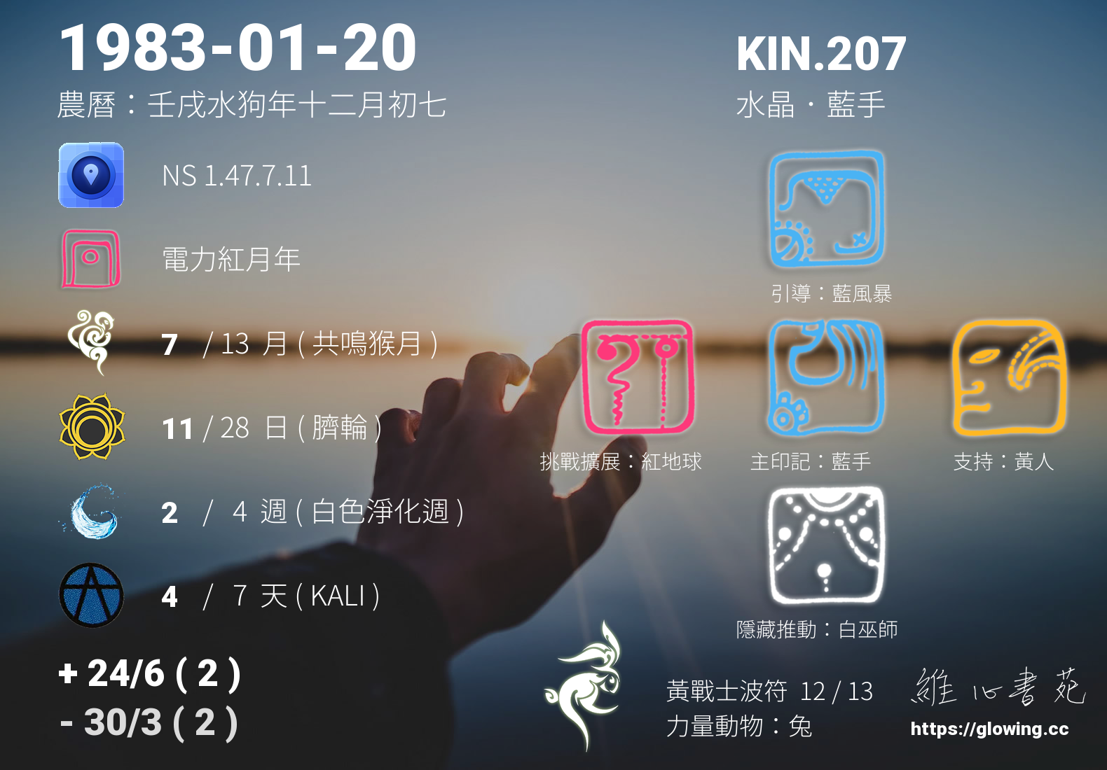 我們可以稱 KIN 207 為 【水晶藍手】 、 【水晶的藍手】 、 【黃戰士波符 之 水晶藍手】 也可以是 【水晶藍手.黃戰士波符】 ,你比較喜歡哪一個稱號呢?
