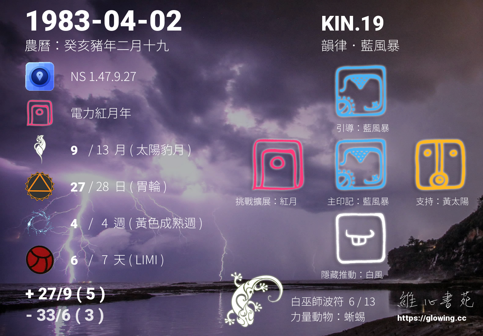 我們可以稱 KIN 19 為 【韻律藍風暴】 、 【韻律的藍風暴】 、 【白巫師波符 之 韻律藍風暴】 也可以是 【韻律藍風暴.白巫師波符】 ,你比較喜歡哪一個稱號呢?