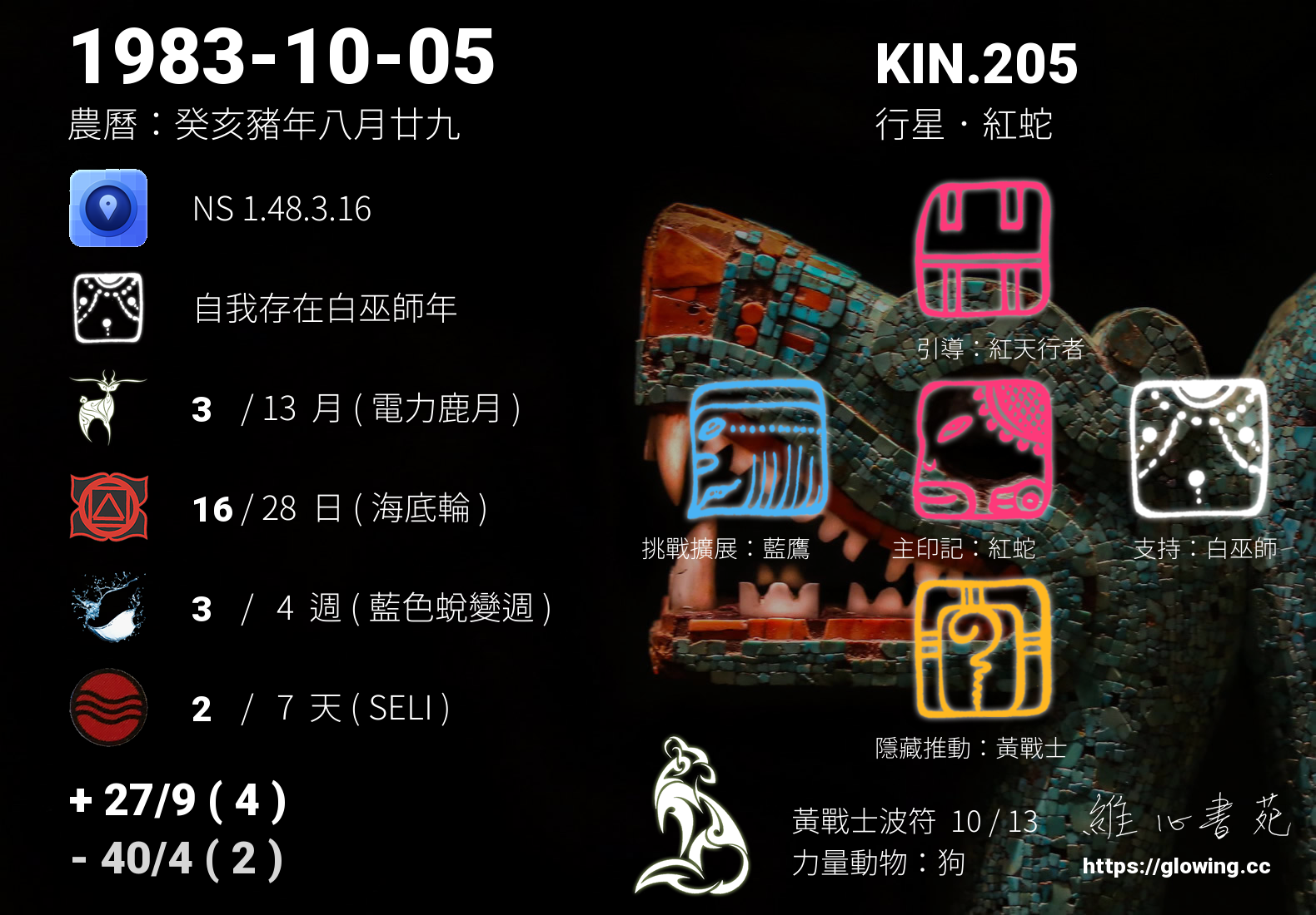 我們可以稱 KIN 205 為 【行星紅蛇】 、 【行星的紅蛇】 、 【黃戰士波符 之 行星紅蛇】 也可以是 【行星紅蛇.黃戰士波符】 ,你比較喜歡哪一個稱號呢?