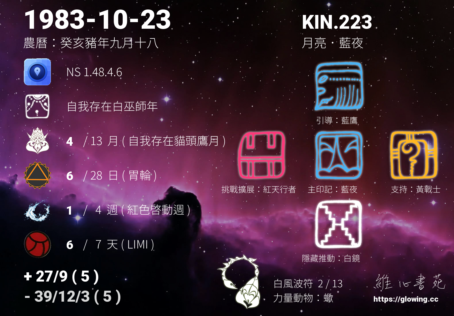 我們可以稱 KIN 223 為 【月亮藍夜】 、 【月亮的藍夜】 、 【白風波符 之 月亮藍夜】 也可以是 【月亮藍夜.白風波符】 ,你比較喜歡哪一個稱號呢?