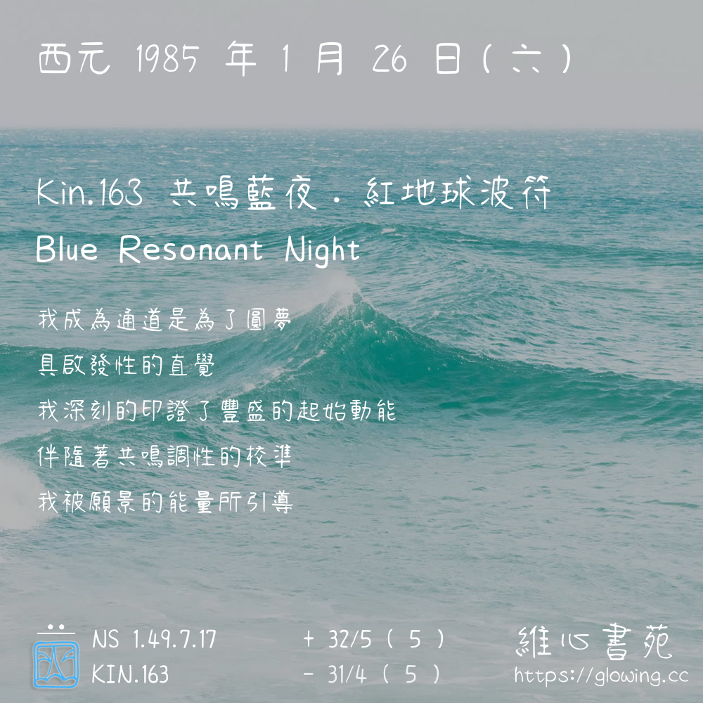 我們可以稱 KIN 163 為 【共鳴藍夜】 、 【共鳴的藍夜】 、 【紅地球波符 之 共鳴藍夜】 也可以是 【共鳴藍夜.紅地球波符】 ,你比較喜歡哪一個稱號呢?