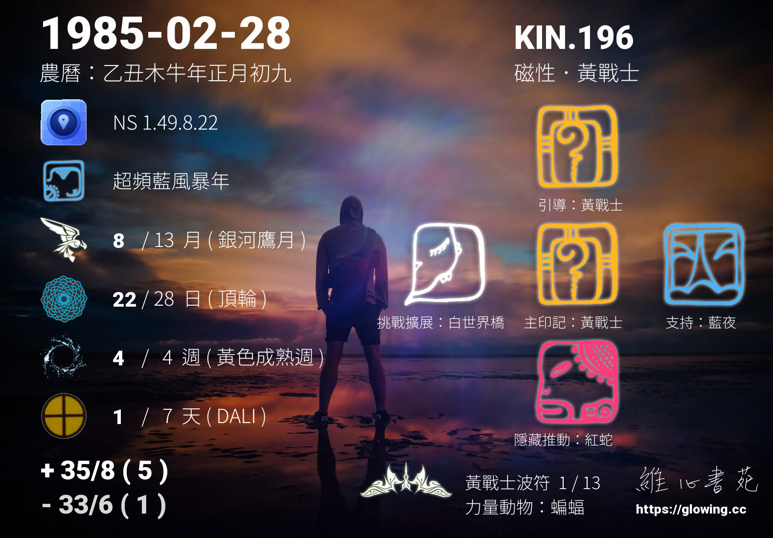 我們可以稱 KIN 196 為 【磁性黃戰士】 、 【磁性的黃戰士】 、 【黃戰士波符 之 磁性黃戰士】 也可以是 【磁性黃戰士.黃戰士波符】 ,你比較喜歡哪一個稱號呢?