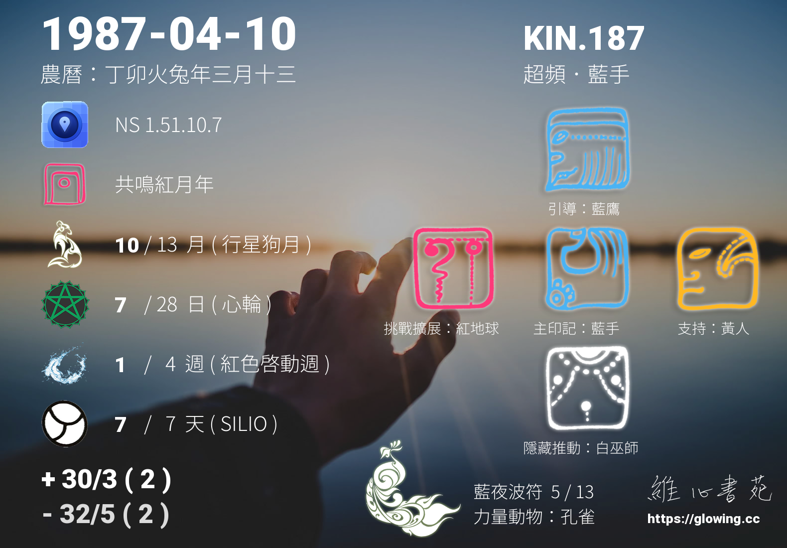 我們可以稱 KIN 187 為 【超頻藍手】 、 【超頻的藍手】 、 【藍夜波符 之 超頻藍手】 也可以是 【超頻藍手.藍夜波符】 ,你比較喜歡哪一個稱號呢?