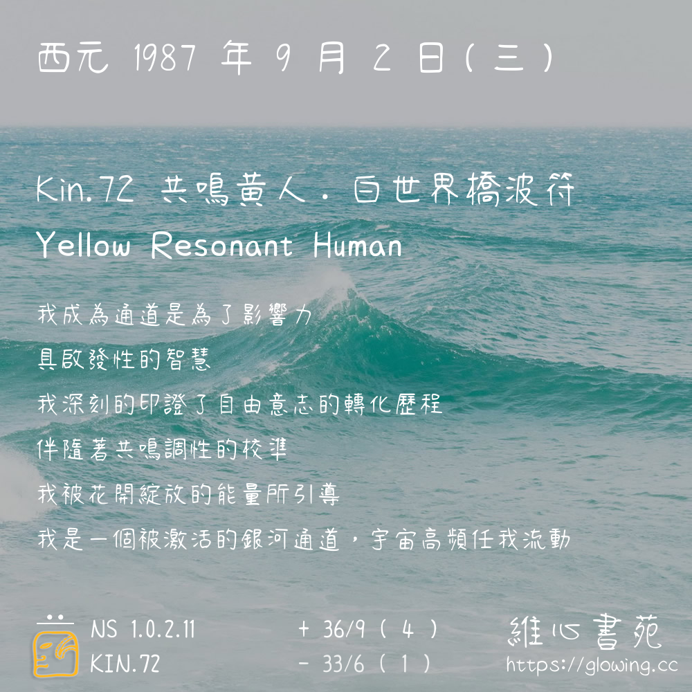 我們可以稱 KIN 72 為 【共鳴黃人】 、 【共鳴的黃人】 、 【白世界橋波符 之 共鳴黃人】 也可以是 【共鳴黃人.白世界橋波符】 ,你比較喜歡哪一個稱號呢?