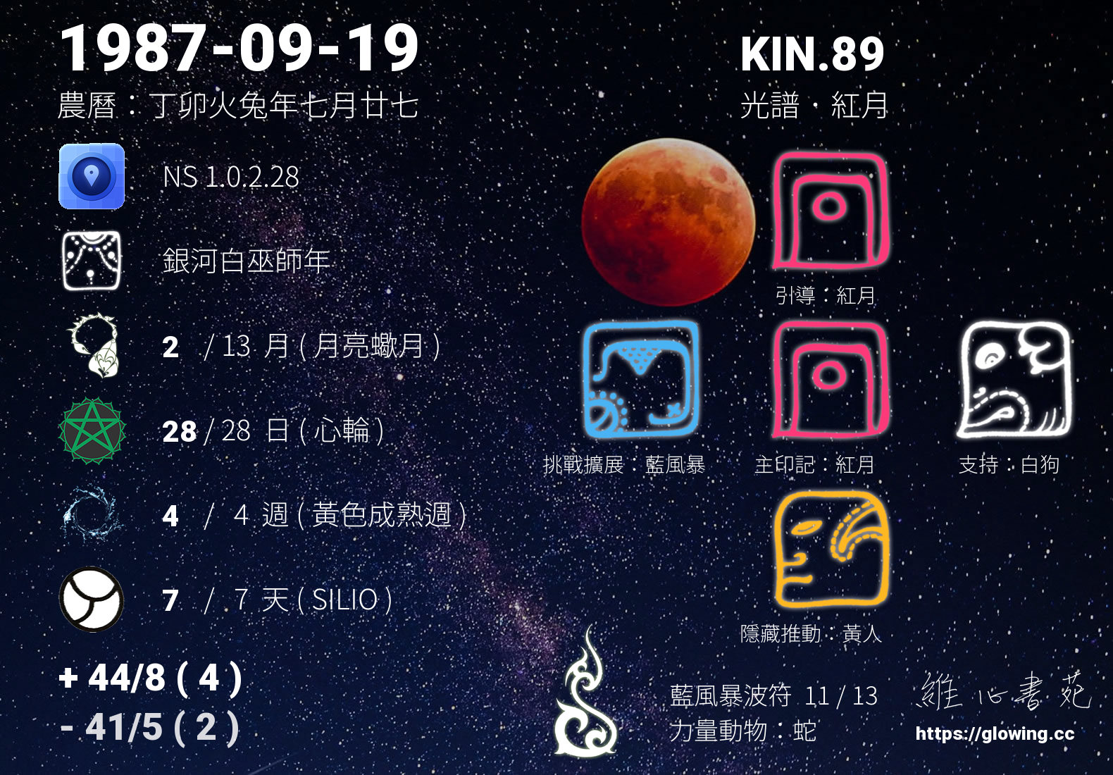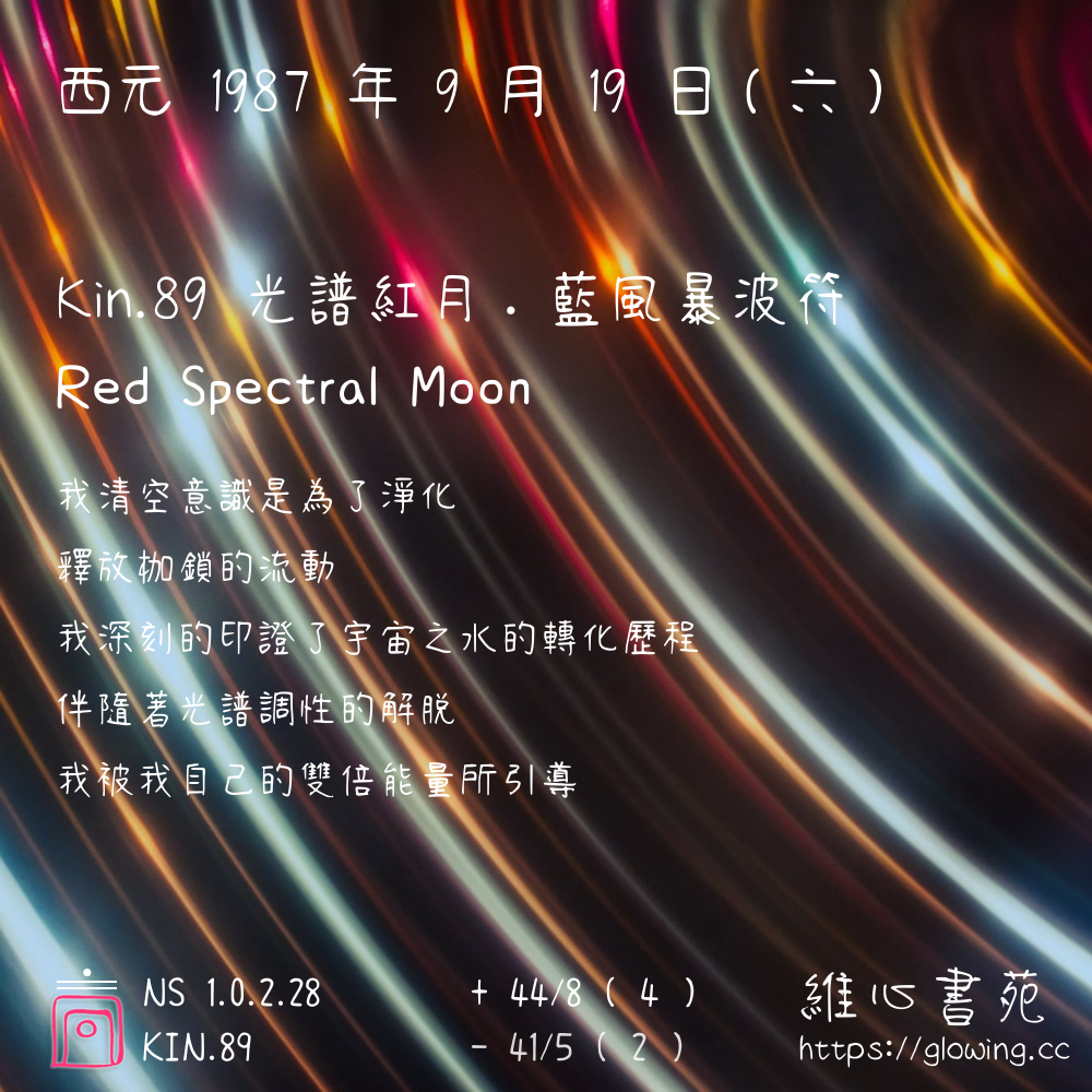 我們可以稱 KIN 89 為 【光譜紅月】 、 【光譜的紅月】 、 【藍風暴波符 之 光譜紅月】 也可以是 【光譜紅月.藍風暴波符】 ,你比較喜歡哪一個稱號呢?