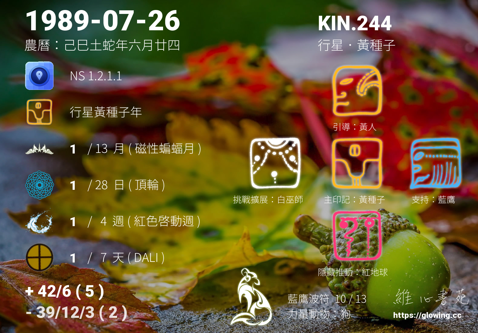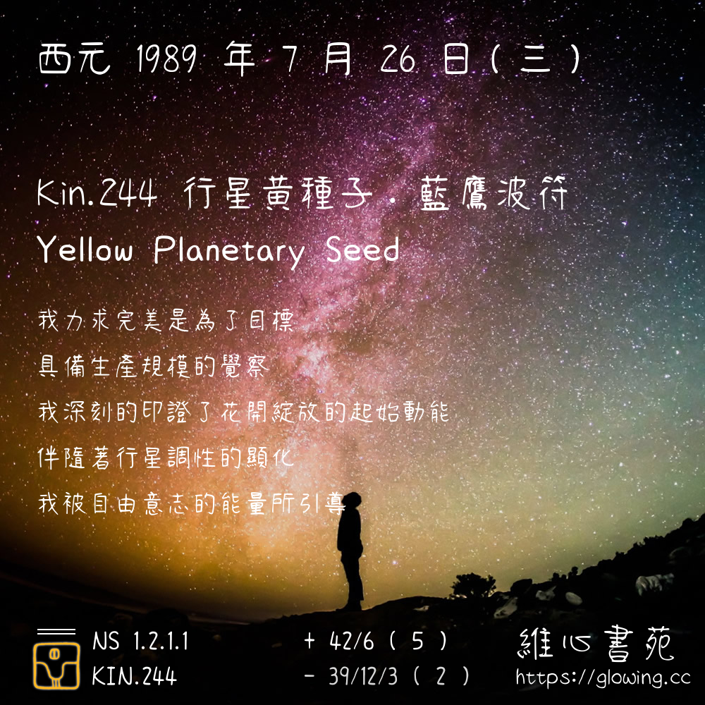 我們可以稱 KIN 244 為 【行星黃種子】 、 【行星的黃種子】 、 【藍鷹波符 之 行星黃種子】 也可以是 【行星黃種子.藍鷹波符】 ,你比較喜歡哪一個稱號呢?