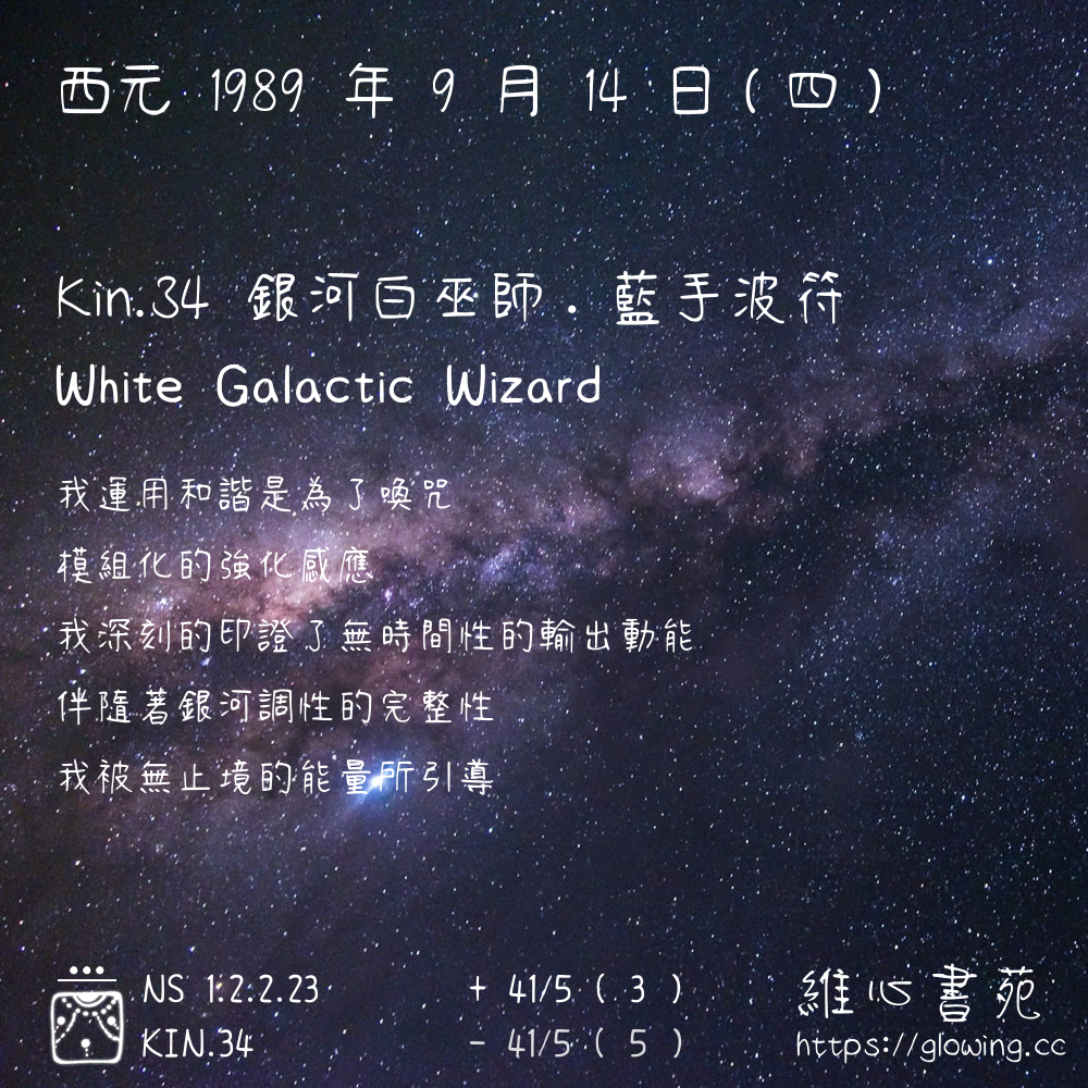 我們可以稱 KIN 34 為 【銀河白巫師】 、 【銀河的白巫師】 、 【藍手波符 之 銀河白巫師】 也可以是 【銀河白巫師.藍手波符】 ,你比較喜歡哪一個稱號呢?