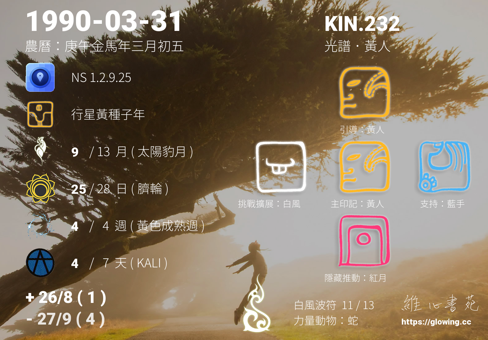 黃人的引導依據KIN的調性不同會有五種可能性,KIN.232的引導圖騰是黃人 , 黃人引導著我們崇尚智慧,探求內心的平靜能量,在一次次更深入看見自己內在的過程,我們能夠更清楚,所有的連結無須外求,我與內在的連結越緊密,生命將越加的繽紛。