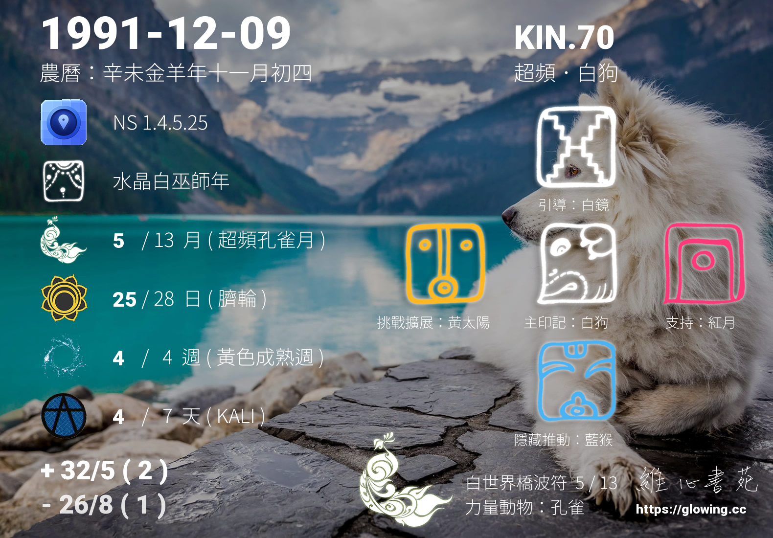 白狗的引導依據KIN的調性不同會有五種可能性,KIN.70的引導圖騰是白鏡 , 白鏡引導著我們認清自我,為我們的未來留下紀錄,將我們每一個思緒紀錄在天體運行中,在我們回歸的那個當下,迴向各所有的存在與眾生,為這個世界留下美麗色彩。