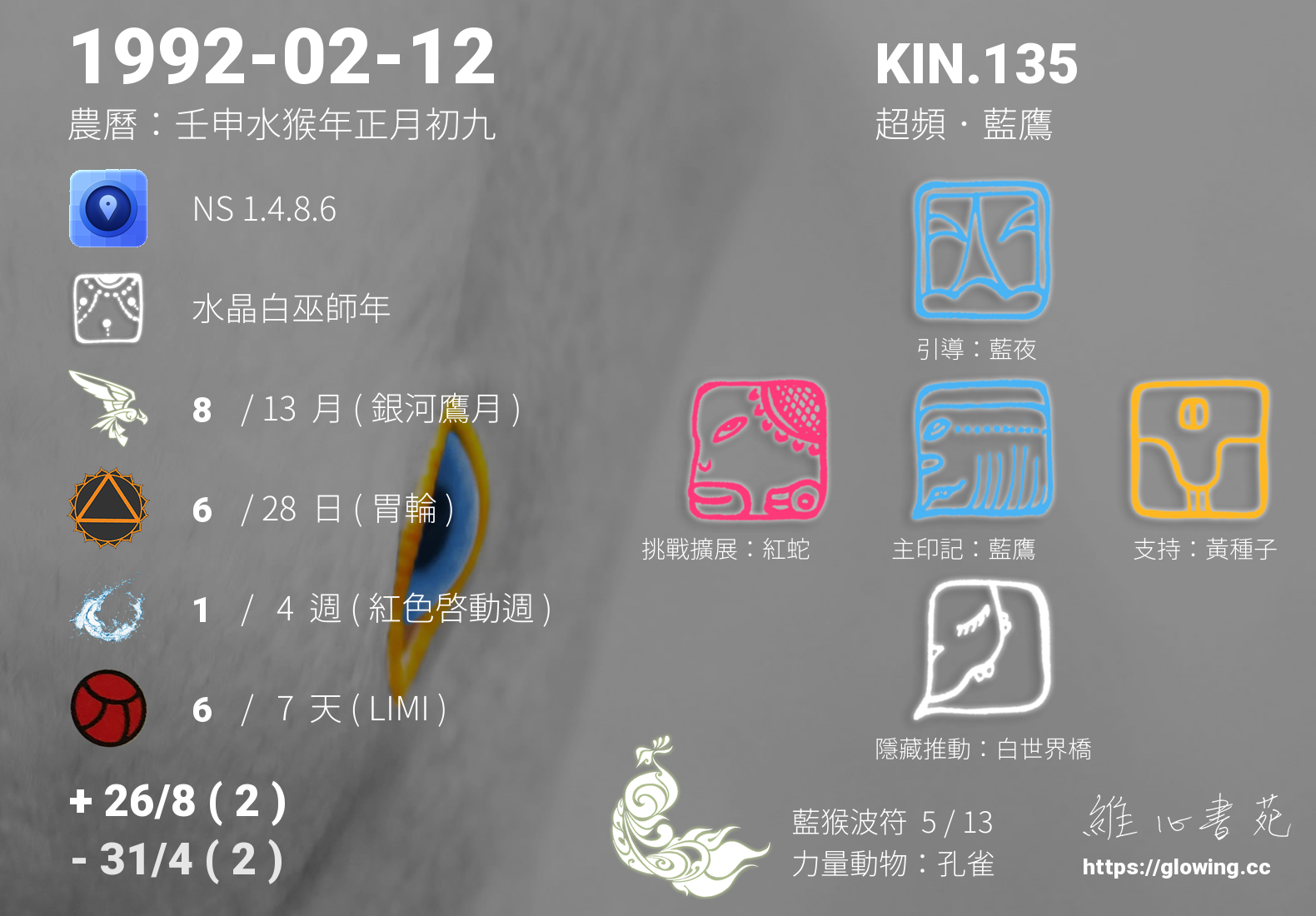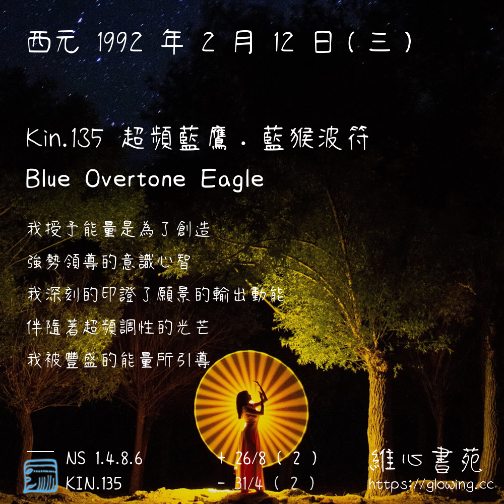 我們可以稱 KIN 135 為 【超頻藍鷹】 、 【超頻的藍鷹】 、 【藍猴波符 之 超頻藍鷹】 也可以是 【超頻藍鷹.藍猴波符】 ,你比較喜歡哪一個稱號呢?