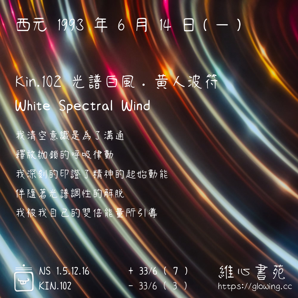 我們可以稱 KIN 102 為 【光譜白風】 、 【光譜的白風】 、 【黃人波符 之 光譜白風】 也可以是 【光譜白風.黃人波符】 ,你比較喜歡哪一個稱號呢?
