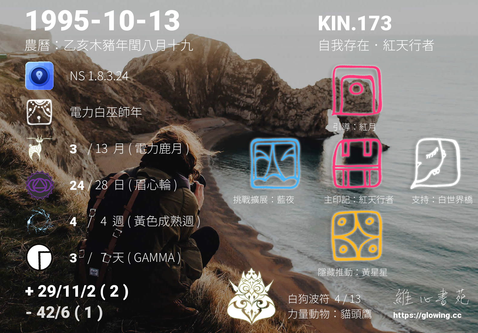 我們可以稱 KIN 173 為 【自我存在紅天行者】 、 【自我存在的紅天行者】 、 【白狗波符 之 自我存在紅天行者】 也可以是 【自我存在紅天行者.白狗波符】 ,你比較喜歡哪一個稱號呢?