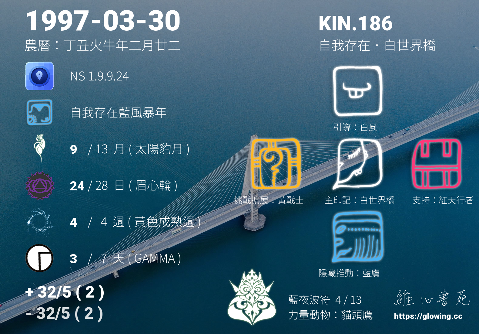 我們可以稱 KIN 186 為 【自我存在白世界橋】 、 【自我存在的白世界橋】 、 【藍夜波符 之 自我存在白世界橋】 也可以是 【自我存在白世界橋.藍夜波符】 ,你比較喜歡哪一個稱號呢?