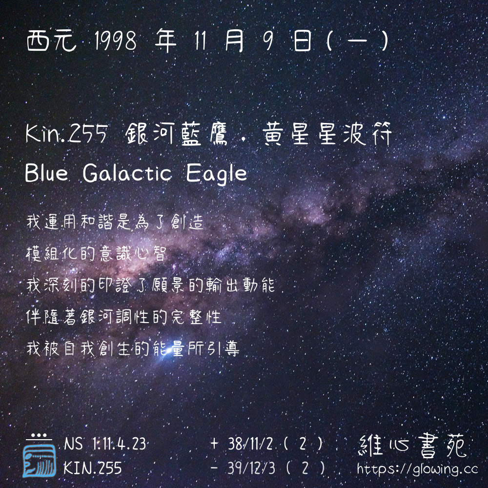 我們可以稱 KIN 255 為 【銀河藍鷹】 、 【銀河的藍鷹】 、 【黃星星波符 之 銀河藍鷹】 也可以是 【銀河藍鷹.黃星星波符】 ,你比較喜歡哪一個稱號呢?