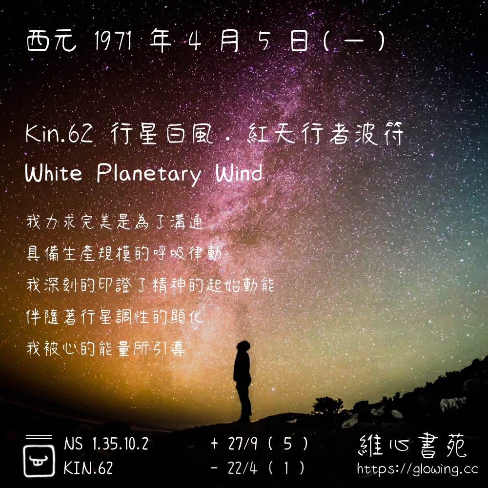 我們可以稱 KIN 62 為 【行星白風】 、 【行星的白風】 、 【紅天行者波符 之 行星白風】 也可以是 【行星白風.紅天行者波符】 ,你比較喜歡哪一個稱號呢?