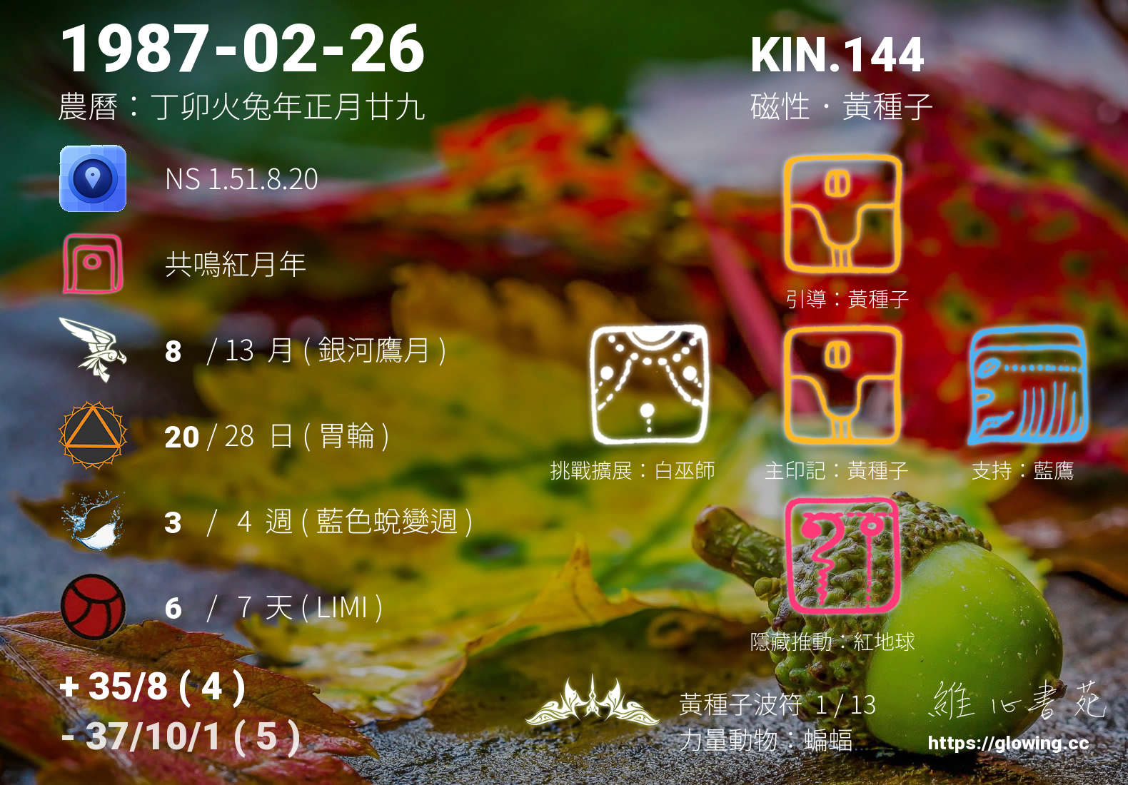 黃種子與白巫師相互為對方的挑戰擴展圖騰, 白巫師是黃種子的挑戰擴展,黃種子蘊藏著無限的希望未來,然而種子發芽茁壯需要時間,然而從黃種子的視角,白巫師的信手捻來快速成就,似乎少了點歷程的經歷體驗,然而所有的歷程不論快慢好壞,其實都會是滋養黃種子成長的所需養分。