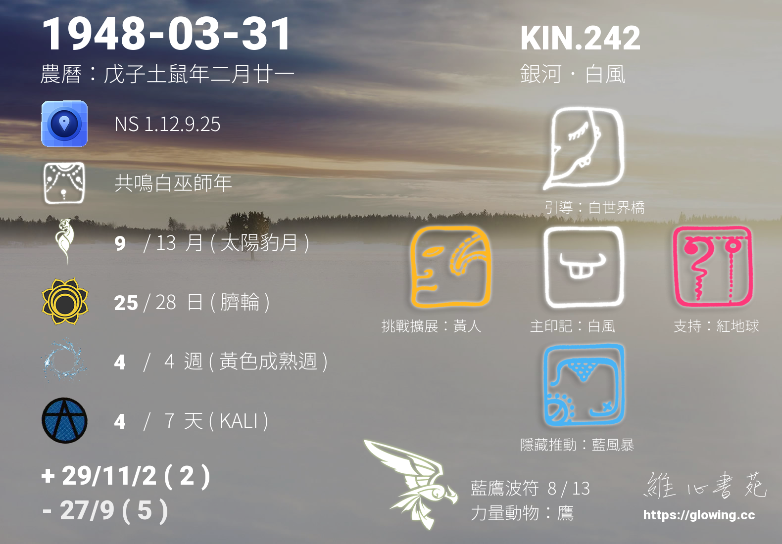 我們可以稱 KIN 242 為 【銀河白風】 、 【銀河的白風】 、 【藍鷹波符 之 銀河白風】 也可以是 【銀河白風.藍鷹波符】 ,你比較喜歡哪一個稱號呢?