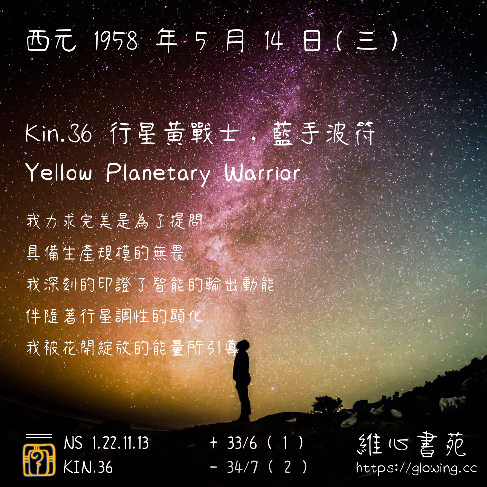 我們可以稱 KIN 36 為 【行星黃戰士】 、 【行星的黃戰士】 、 【藍手波符 之 行星黃戰士】 也可以是 【行星黃戰士.藍手波符】 ,你比較喜歡哪一個稱號呢?