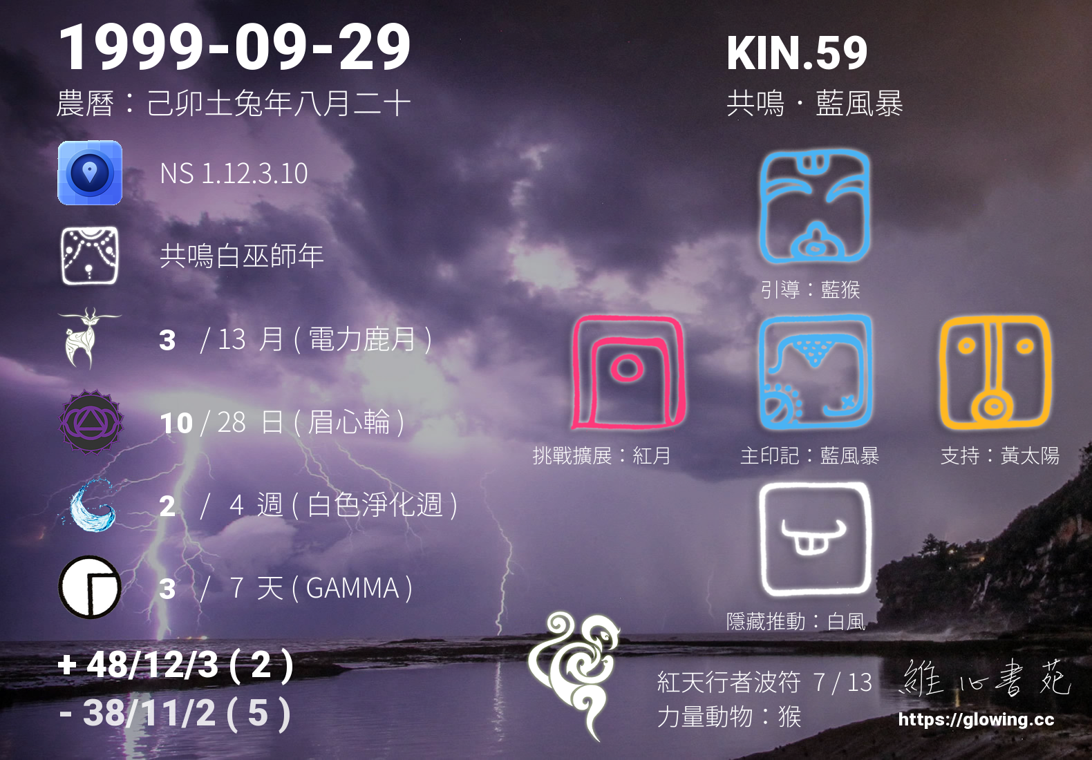 藍風暴的引導依據KIN的調性不同會有五種可能性,KIN.59的引導圖騰是藍猴 , 在藍猴的引導下,我們徜徉在人生遊樂場的思維下,去體會人生如戲,夢如人生的荒誕喜劇,生命從來就不是嚴肅的課題,嚴肅的鳥不會飛、嚴肅的雞不會叫、嚴肅的人沒有心,嚴肅會導致能量閉塞,沒有心,不會怎樣,就只是沒有滋味平淡人生乾癟而已。