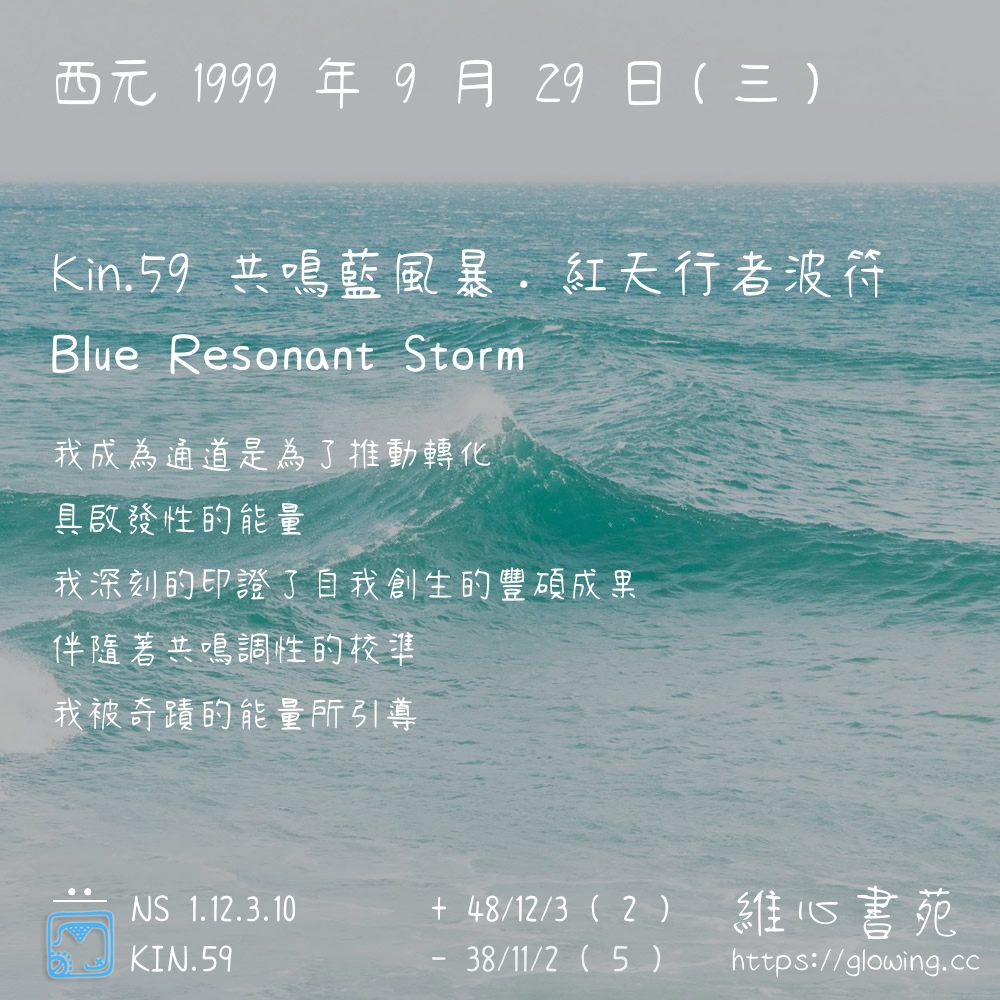 我們可以稱 KIN 59 為 【共鳴藍風暴】 、 【共鳴的藍風暴】 、 【紅天行者波符 之 共鳴藍風暴】 也可以是 【共鳴藍風暴.紅天行者波符】 ,你比較喜歡哪一個稱號呢?