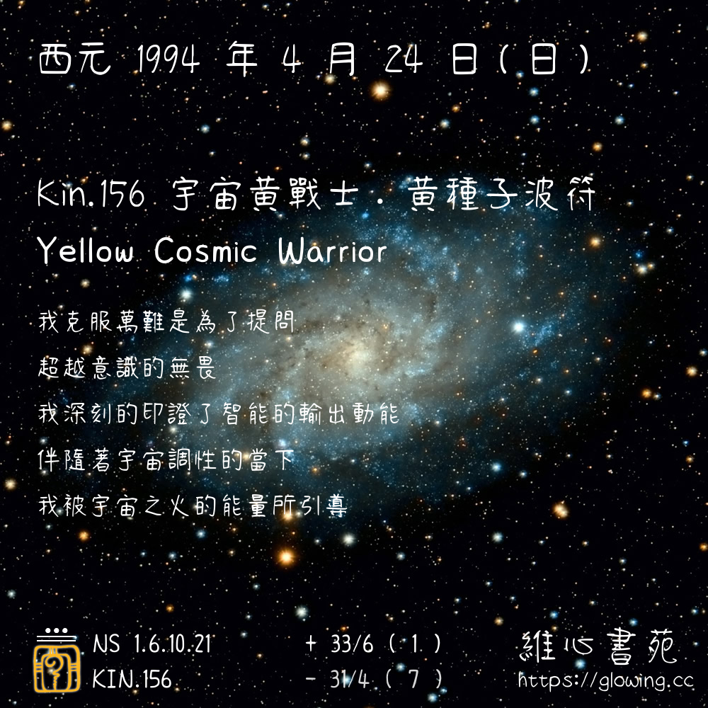 我們可以稱 KIN 156 為 【宇宙黃戰士】 、 【宇宙的黃戰士】 、 【黃種子波符 之 宇宙黃戰士】 也可以是 【宇宙黃戰士.黃種子波符】 ,你比較喜歡哪一個稱號呢?