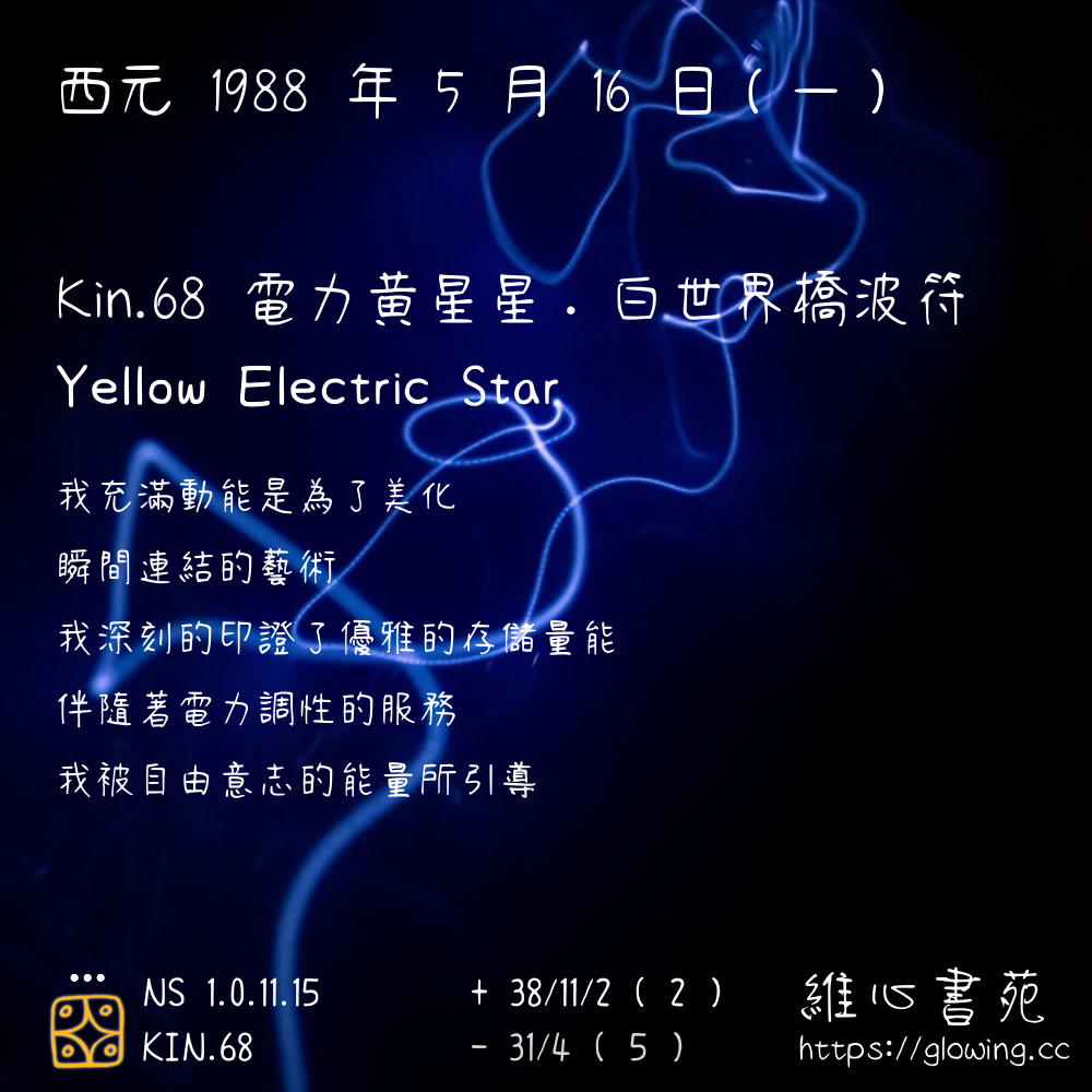我們可以稱 KIN 68 為 【電力黃星星】 、 【電力的黃星星】 、 【白世界橋波符 之 電力黃星星】 也可以是 【電力黃星星.白世界橋波符】 ,你比較喜歡哪一個稱號呢?
