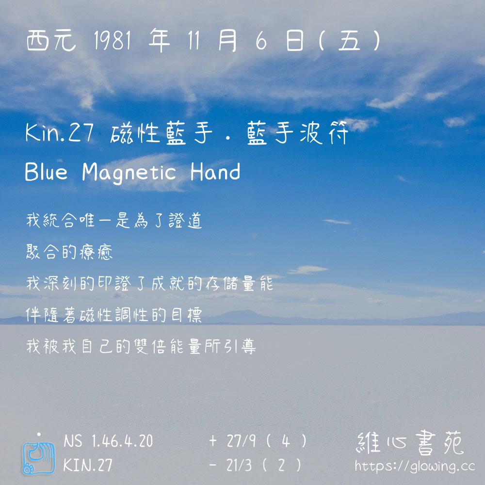我們可以稱 KIN 27 為 【磁性藍手】 、 【磁性的藍手】 、 【藍手波符 之 磁性藍手】 也可以是 【磁性藍手.藍手波符】 ,你比較喜歡哪一個稱號呢?