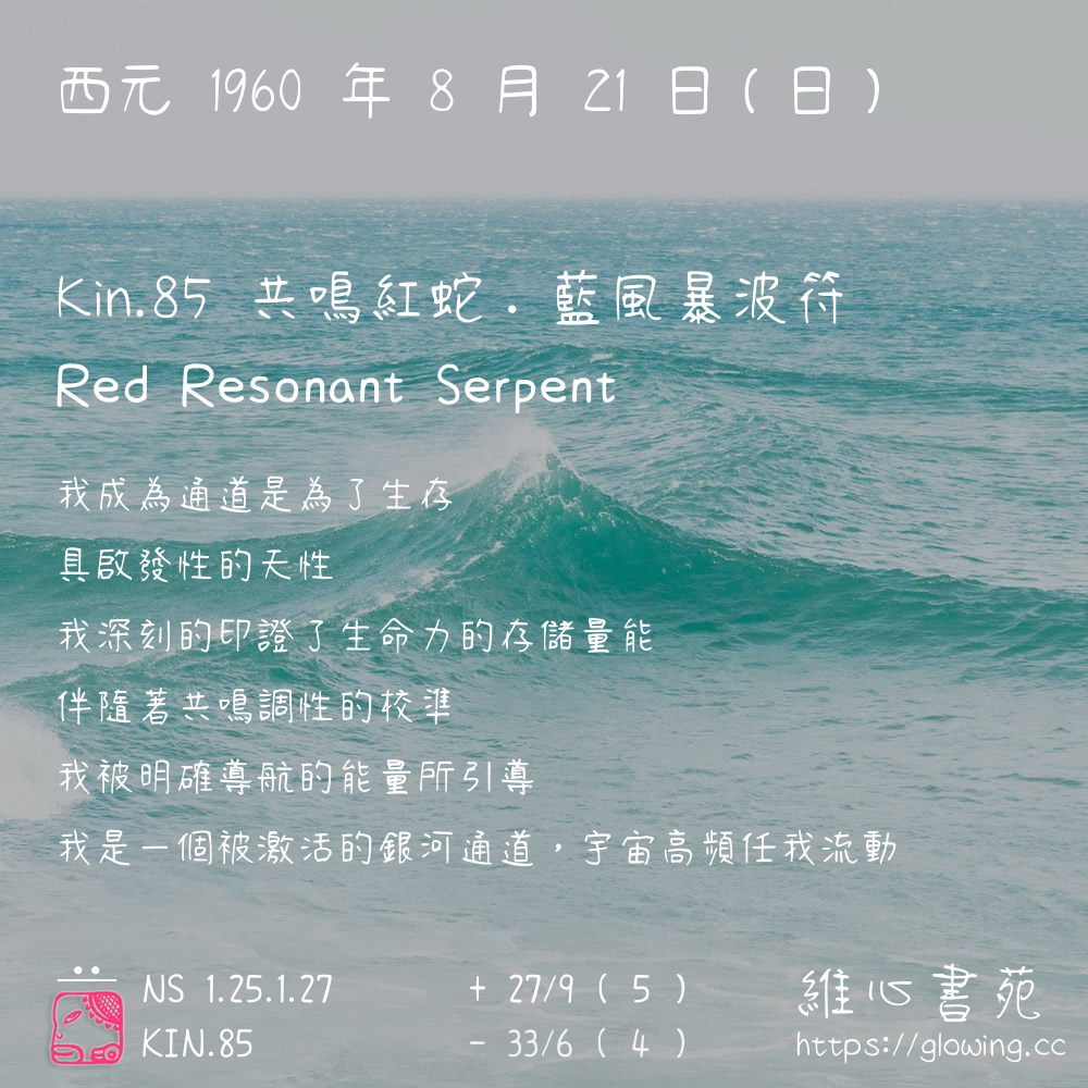 我們可以稱 KIN 85 為 【共鳴紅蛇】 、 【共鳴的紅蛇】 、 【藍風暴波符 之 共鳴紅蛇】 也可以是 【共鳴紅蛇.藍風暴波符】 ,你比較喜歡哪一個稱號呢?